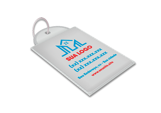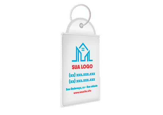 O chaveiro de Imobiliária já acompanha a argola e possui bolso no verso para identificar e inserir informações sobre o imóvel.