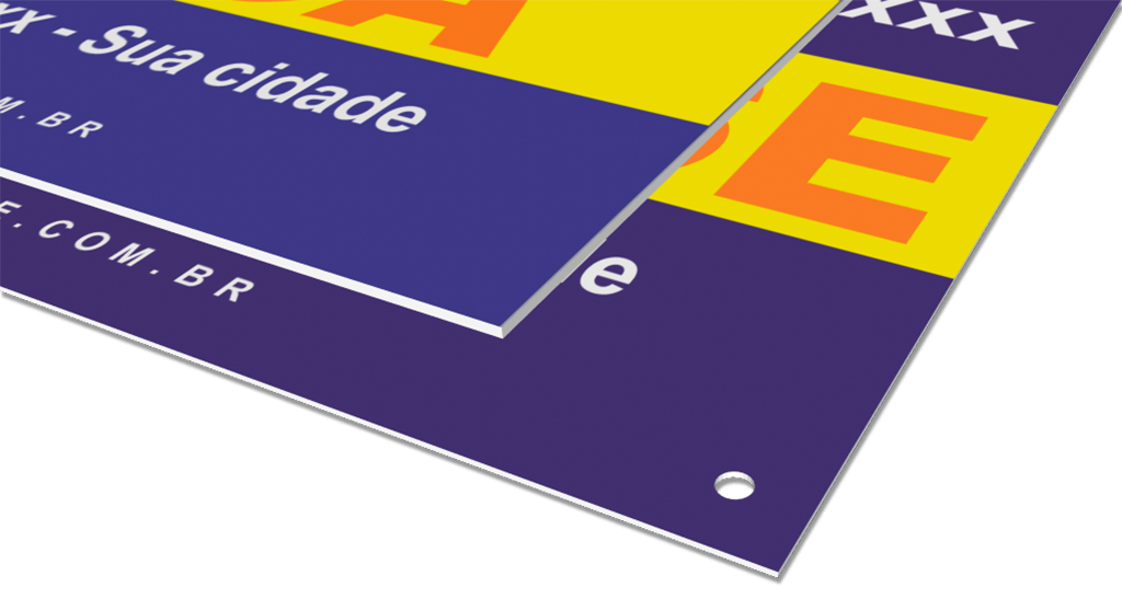 Oferecemos placas em PS 1mm e PS 2mm com furos ou sem. O Poliestireno é um plástico rígido e resistente a impactos, também atóxico. É impermeável e possui diversas aplicabilidades, principalmente pela praticidade e resistência. Nós da Valdô produzimos as placas para imobiliárias com impressão sem limite de cores com um excelente custo-benefício, entregando qualidade e personalização no melhor preço.